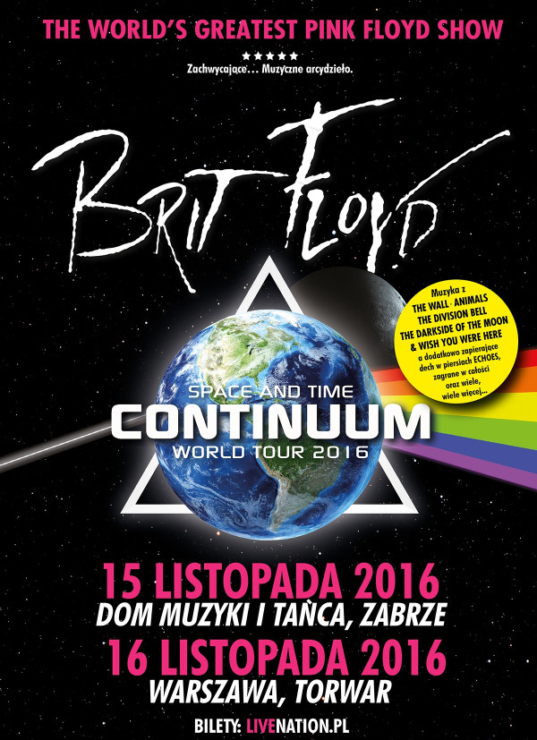 Po wielkim sukcesie trasy z 2015 roku, która objęła aż 146 koncertów na całym świecie, Brit Floyd, The World’s Greatest Pink Floyd Show, powraca do Europy w 2016 roku, aby kontynuować tę wspaniałą podróż przez 50 lat twórczości Pink Floyd. Oprócz ulubionych utworów z The Dark Side of the Moon, Wish You Were Here, Animals, The Wall czy The Division Bell nie zabraknie również innych, mniej znanych kawałków z bogatego katalogu klasyków rocka. Brit Floyd uraczy publiczność zapierającym dech w piersiach, odegranym w całości utworem Echoes, pochodzącym z albumu Meddle. Nie zabraknie również innych muzycznych perełek z repertuaru Pink Floyd!