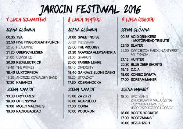 Około 50. koncertów, różne style muzyczne – od ciężkiego rocka po przyjazne reggae, zespoły polskie i zagraniczne, gwiazdy i debiutanci, a ponadto wystawy, spotkania z ciekawymi ludźmi i mnóstwo dodatkowych atrakcji – tak właśnie zapowiada się Jarocin Festiwal 2016. W dniach 7 – 9 lipca Jarocin ponownie stanie się stolicą polskiego rocka! Tegoroczna edycja festiwalu będzie miała najmocniejszą obsadę w historii.