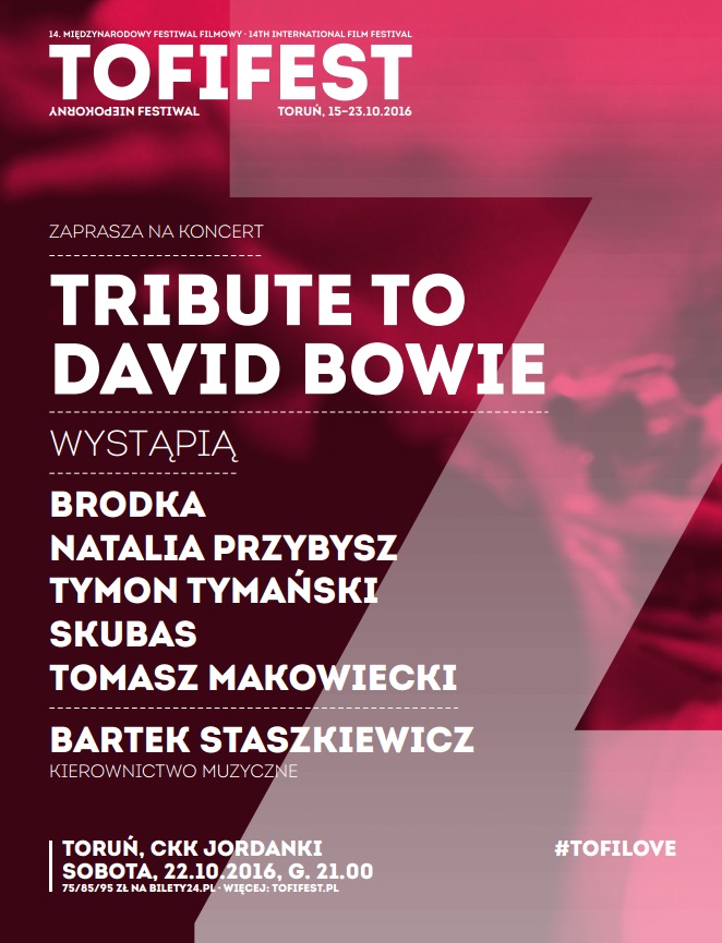 Międzynarodowy Festiwal Filmowy Tofifest zaprasza na pierwszy w Polsce koncert, podczas którego znakomici muzycy oddadzą hołd gwieździe sceny i ekranu, Davidowi Bowie. Koncert, który odbędzie się podczas zakończenia 14. edycji Tofifest, 22 października, będzie pierwszym w naszym kraju hołdem polskich artystów dla prekursora wielu gatunków muzyki: glam rocka, art rocka, dance popu, punku i muzyki elektronicznej.