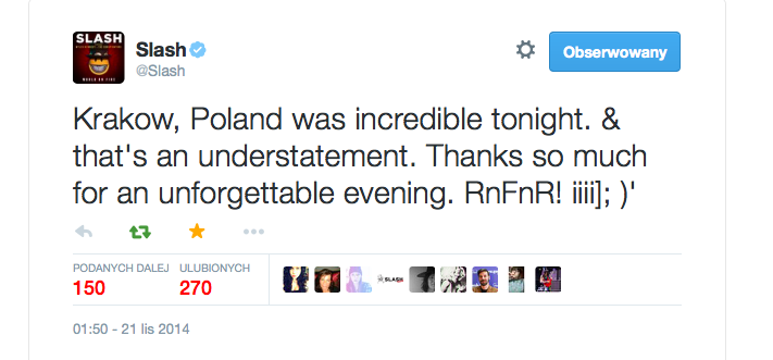 Myles Kennedy wielkorotnie dziękował polskiej publiczności za atmosferę panującą w Kraków Arenie, do mikrofonu przemówił też sam Slash dziękując fanom za wspólną zabawę. Kilka chwil po zakończeniu koncertu podziękowania pojawiły się także na twitterze artysty: