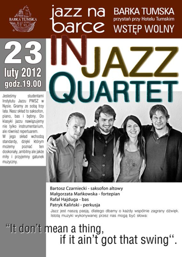 Już 23 lutego na scenie Barki Tumskiej wystąpi grupa InJazz Quartet. To już kolejny koncert wrocławskich muzyków w oryginalnej scenerii restauracji na wodzie. W najbliższy czwartek zapraszamy szczególnie miłośników bluesa, bo klasyki tego właśnie gatunku zaprezentuje zespół.