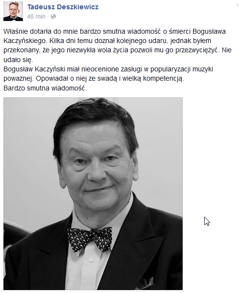 - Właśnie dotarła do mnie bardzo smutna wiadomość o śmierci Bogusława Kaczyńskiego. Kilka dni temu doznał kolejnego udaru, jednak byłem przekonany, że jego niezwykła wola życia pozwoli mu go przezwyciężyć. Nie udało się. Bogusław Kaczyński miał nieocenione zasługi w popularyzacji muzyki poważnej. Opowiadał o niej ze swadą i wielką kompetencją. Bardzo smutna wiadomość - napisał Deszkiewicz na facebooku.