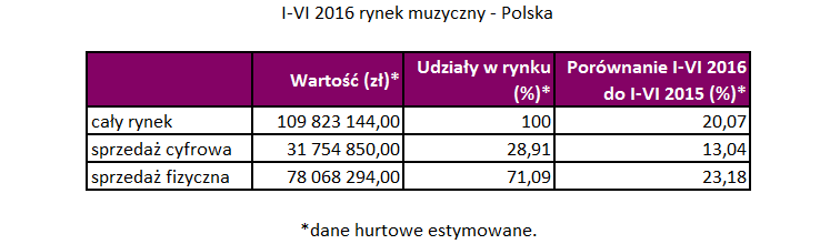 Zwyżkę na rynku cyfrowym zagwarantował streaming, który wzrósł o 23,42% i stanowi już ponad 78% sprzedaży cyfrowej. Wartość pobrań muzyki z Internetu spadła o ponad 28%, pobrań na telefony komórkowe – o 19,26%. Cała sprzedaż cyfrowa osiągnęła w pierwszym półroczu 2016 roku poziom prawie 32 mln zł, co stanowi wzrost o 13,04%. Wynik ten przełożył się na prawie 29-procentowy udział w rynku.