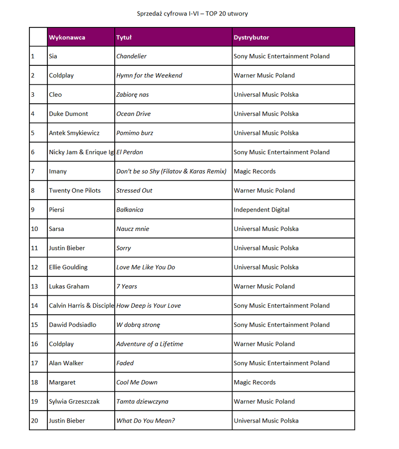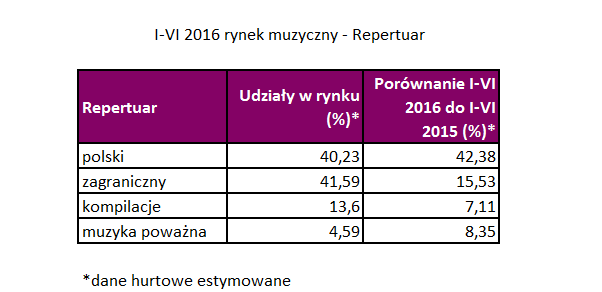 Maciej Kutak, członek zarządu ZPAV i Managing Director Sony Music Entertainment Eastern Europe, dodaje: Wzrost rynku muzycznego w pierwszej połowie roku 2016 nieoczekiwanie wygenerowany jest w dużej mierze przez wyraźny wzrost sprzedaży fizycznej, która zanotowała dwukrotnie większą dynamikę od rynku cyfrowego. Pod względem kategorii – rośnie wszystko, lecz zdecydowanym driverem jest znaczący rozwój sprzedaży rodzimego repertuaru. Zarówno pod względem premierowym, jak i katalogowym, to był bardzo udany okres w porównaniu do poprzedniego półrocza. Z całą pewnością czynnikami wzrostu okazały się też winyle, których rynek ciągle mocno rośnie oraz zwiększenie liczby akcji sprzedażowych z ofertą muzyczną w porównaniu do poprzedniego roku przez sieć Biedronka.