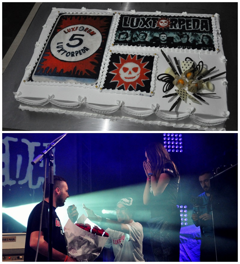 Trzeba przyznać, że w trakcie tegorocznej edycji nie brakowało niespodzianek! Jedną z nich były publiczne oświadczyny w trakcie koncertu Luxtorpedy (i trzeba nadmienić, że to nie pierwsze oświadczyny w takich okolicznościach, podobna akcja miała miejsce podczas zeszłorocznego koncertu w warszawskiej Stodole). To tylko potwierdza, że Luxtorpeda to naprawdę rodzinny zespół, skoro nawet na ich koncertach tworzą się przyszłe rodziny! Poza przyszłym małżonkiem, cała publika usłyszała to wyczekane "TAK!", czego z tego miejsca gratuluję! Ale nie tylko publikę czekała niespodzianka (zagranie całej płyty „MYWASWYNAS” nie liczymy jako niespodzianki, bo było to ogłaszane już wcześniej – ale jeśli ktoś nie wiedział i poczuł się zaskoczony, dopisujemy to również drobnym drukiem do listy niespodzianek). Otóż owiane już sławą LuxForum, zadbało o ogromny tort ze zdjęciami Luxtorpedy, który LuxRodzinka wraz z LuxChłopakami dosłownie zmiotła ze stołu! I to była właśnie ta chwila, kiedy sami organizatorzy mogli na chwilę zatrzymać się i odetchnąć – prawie niczym gospodarze na domówce, którzy po ogarnięciu całej imprezy, dopiero w środku mają czas się nią cieszyć. Niemniej jednak – musieli się poczuć bardzo docenieni. I tu wielkie brawa dla całego LuxForum: po pierwsze – za sam pomysł, a po drugie – za doskonałą organizację ogarnięcia tematu.
